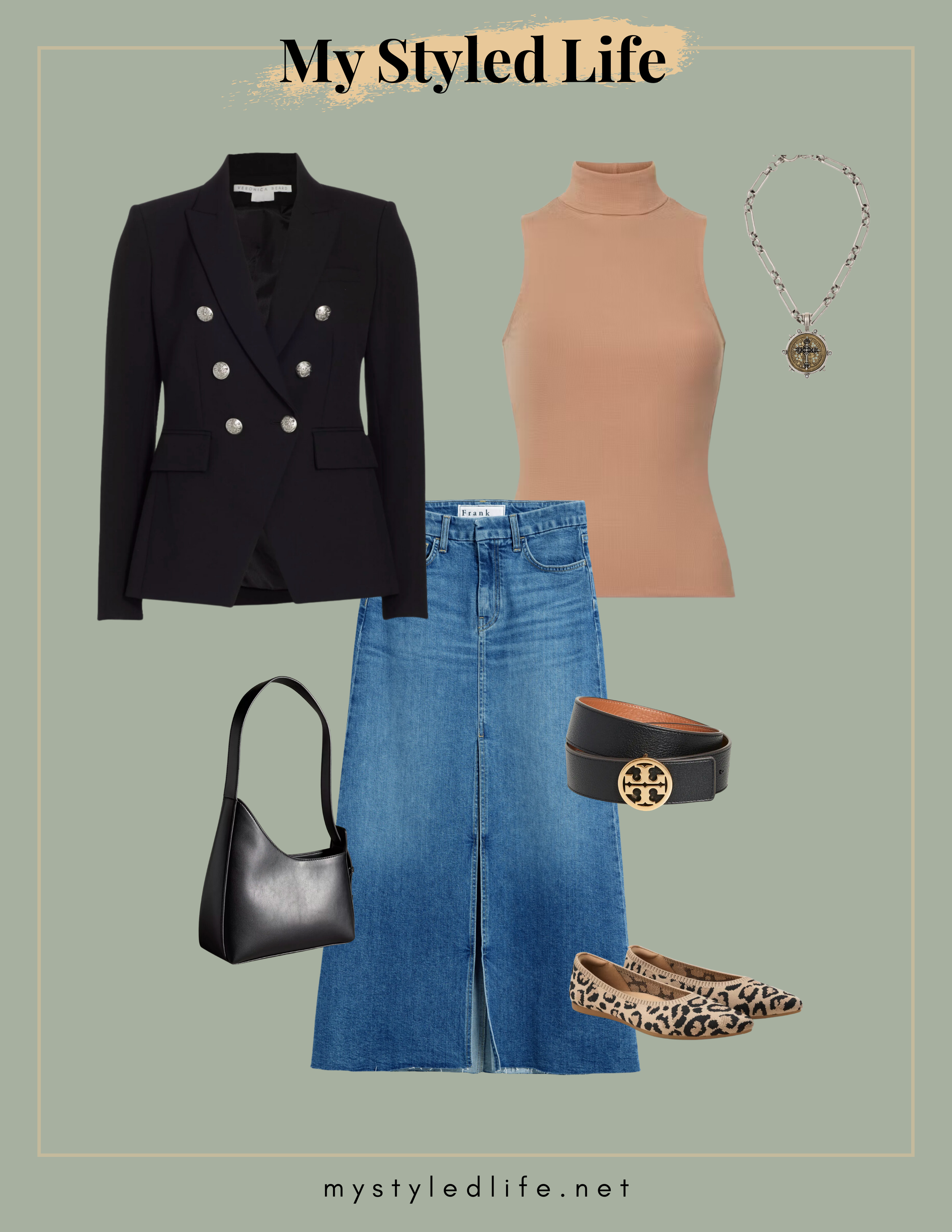 2 key top layers will add polish to your looks: A slim-fitting black blazer and a puff sleeve denim jacket.