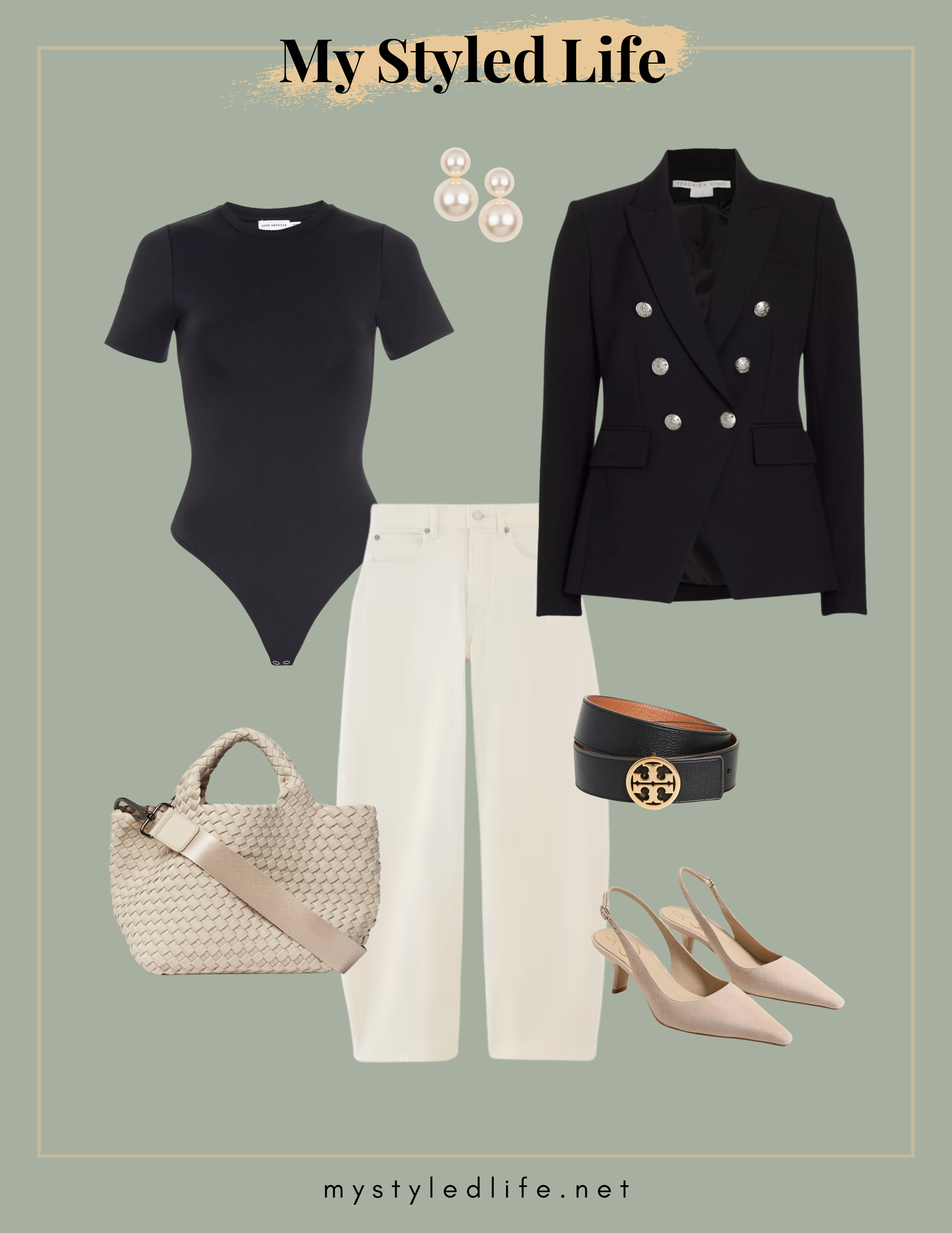 I’ve chosen 3 versatile tops for this capsule: A sleeveless knit top, black bodysuit and elevated white tee.