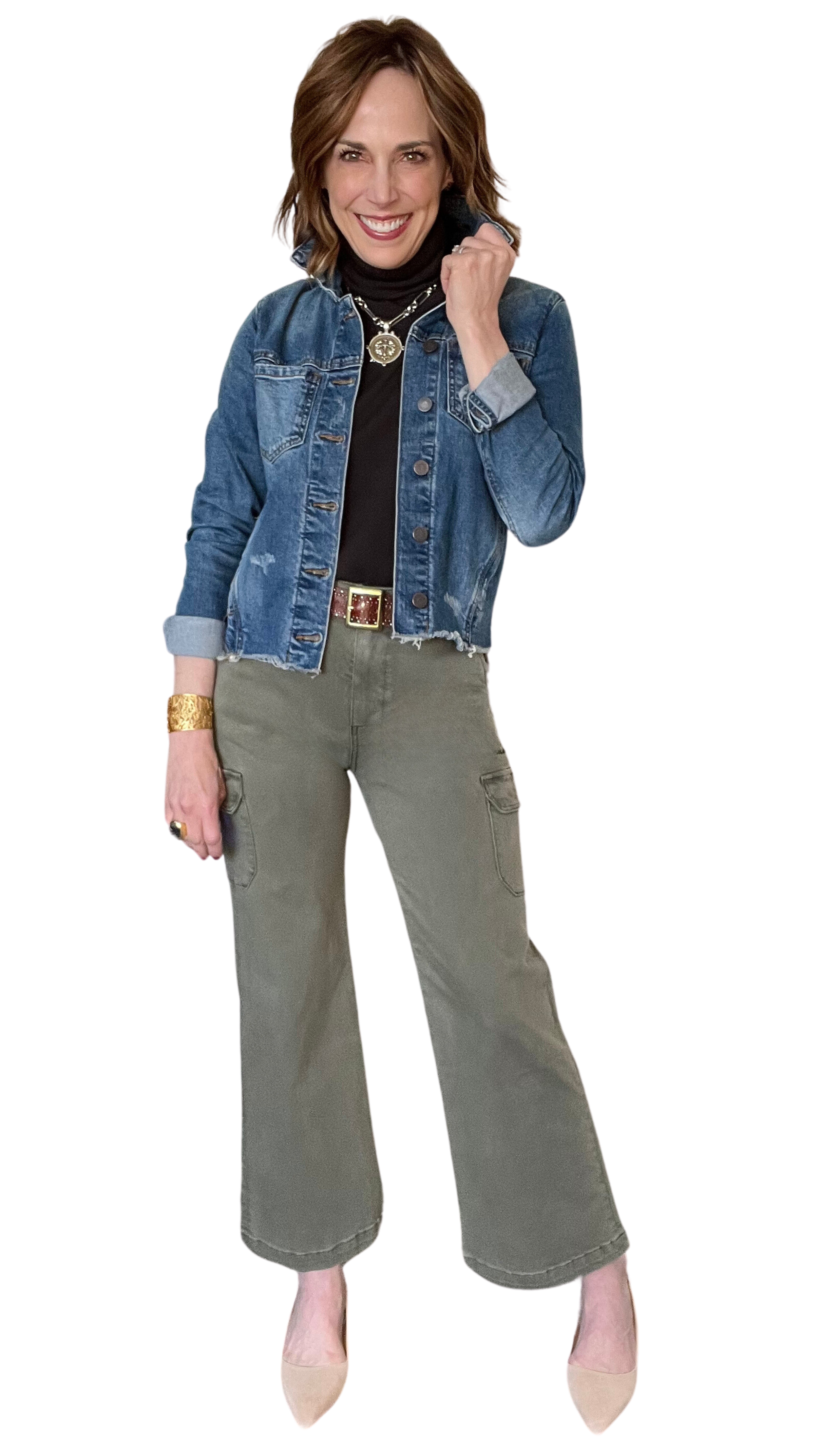 Pant styles are where things have changed a lot over the past few seasons. I chose a subtle barrel-leg jean in ecru, a cargo pant and flared black ponte pants for this capsule.